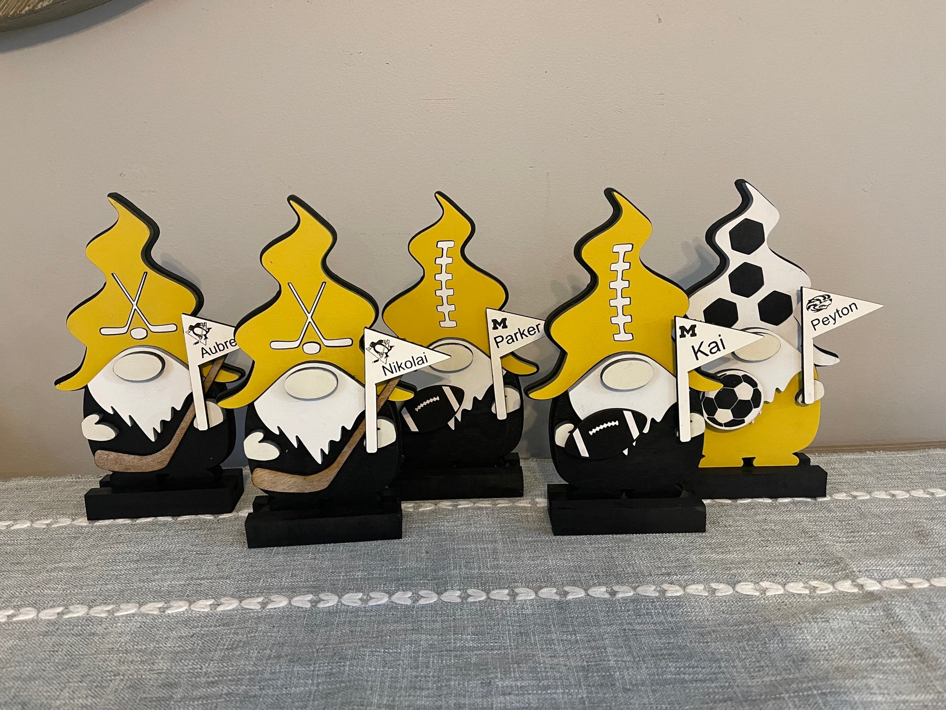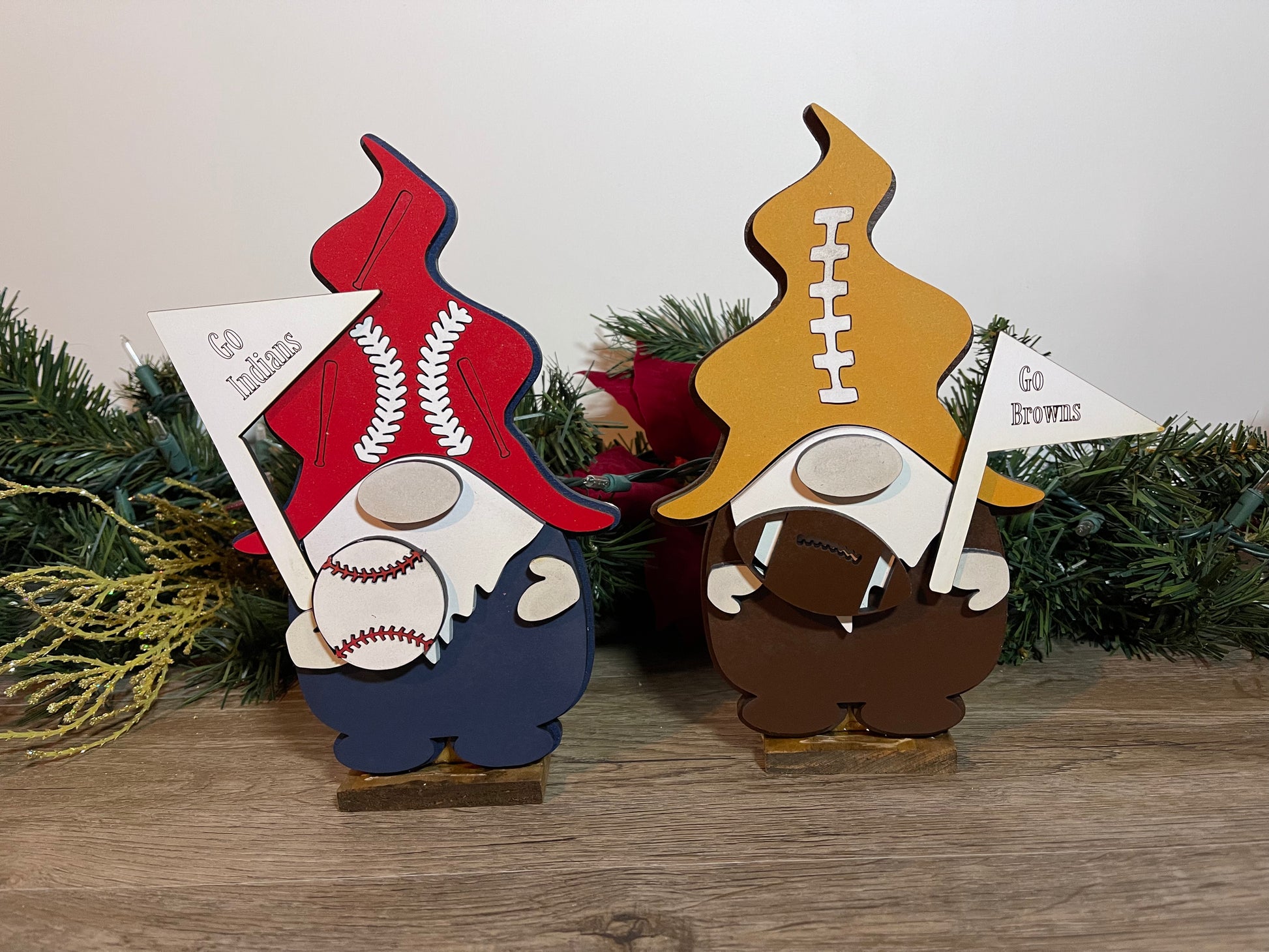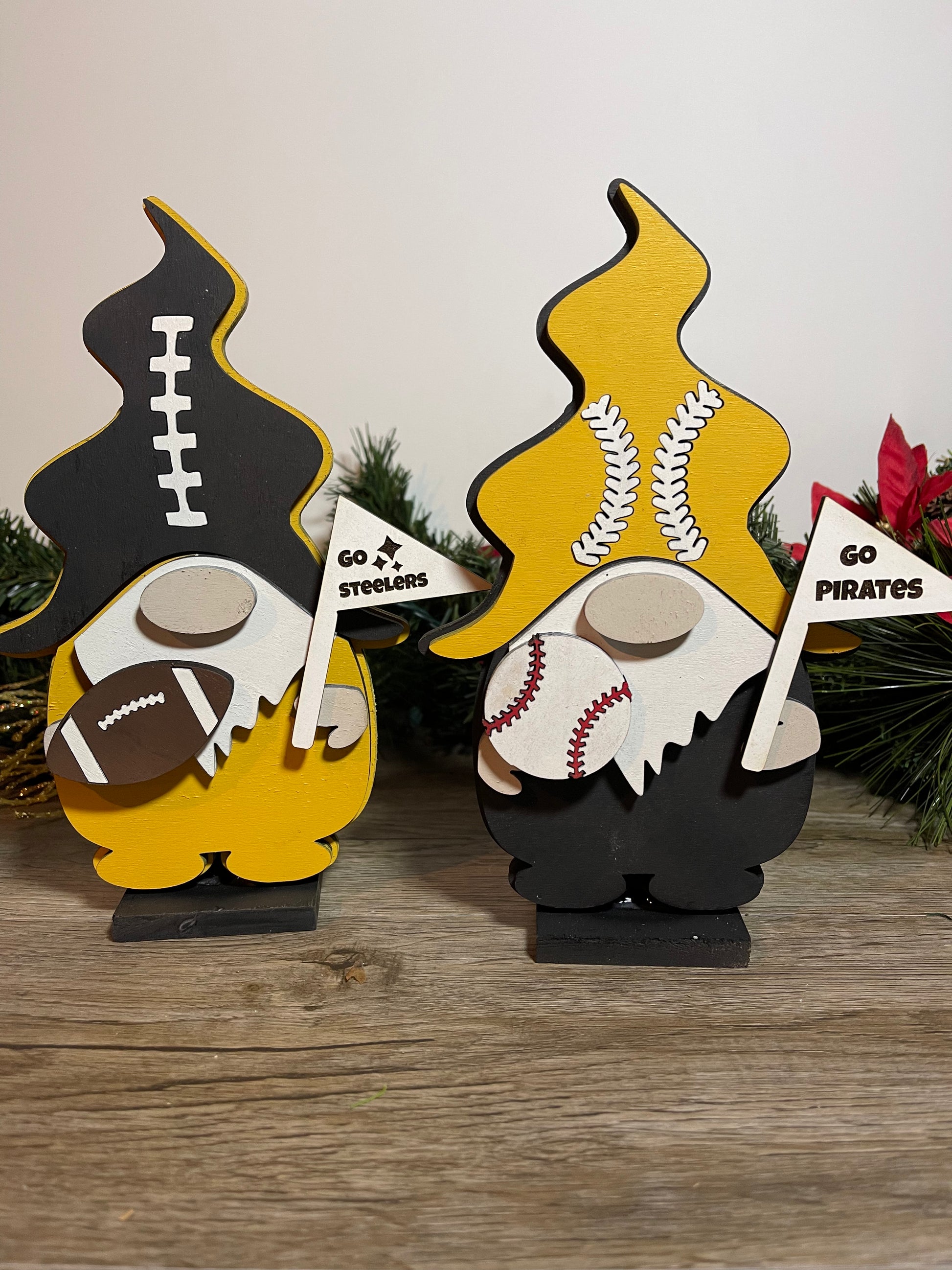 Wood painted Gnomes available in different sports themes. Please note different variants in choices. With stand gnomes measure 9 in tall and average 5 in wide.