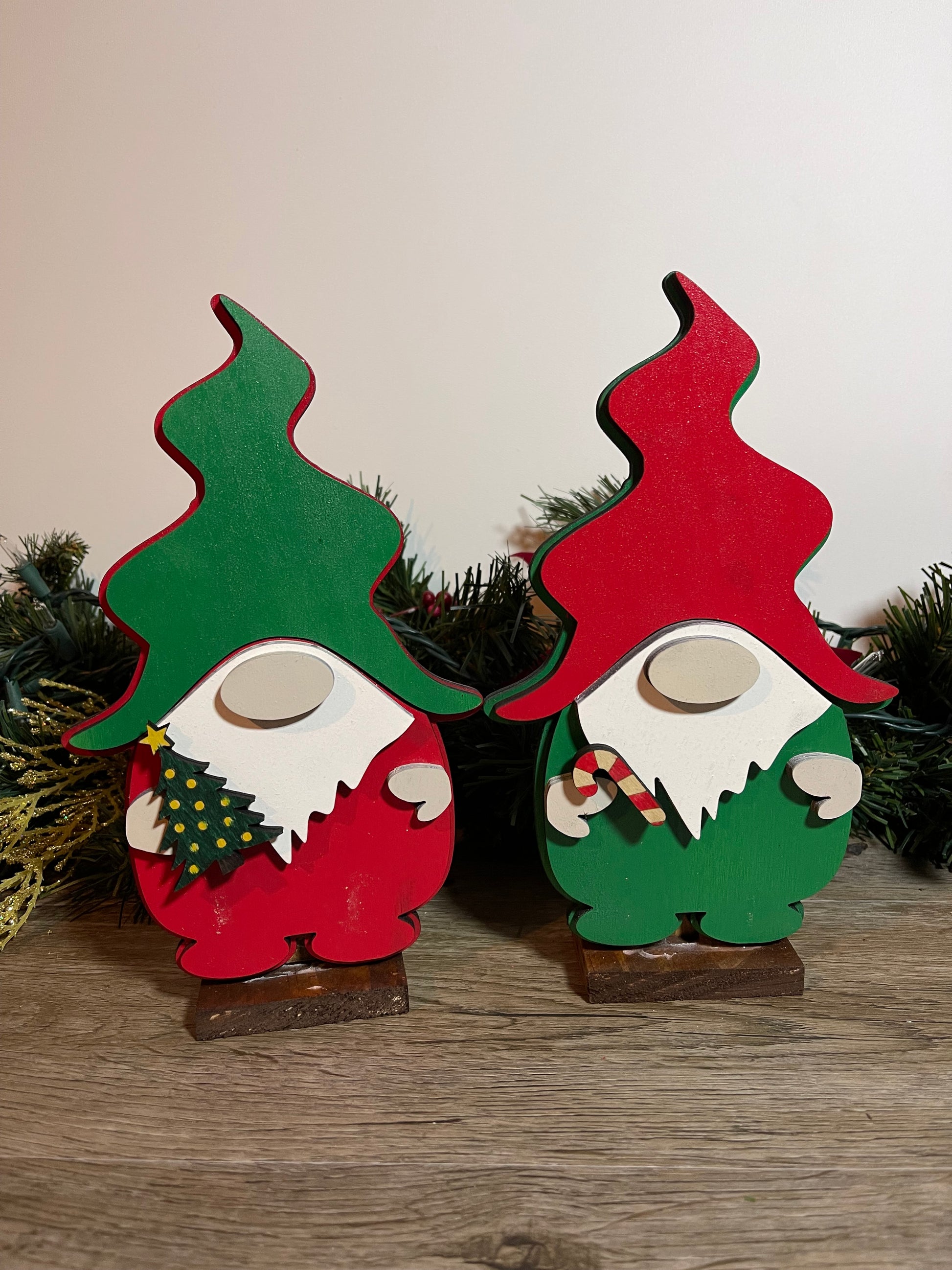 Wood painted Gnomes available in different Christmas themes. Please note different variants in choices. With stand gnomes measure 9 in tall and average 5 in wide.
