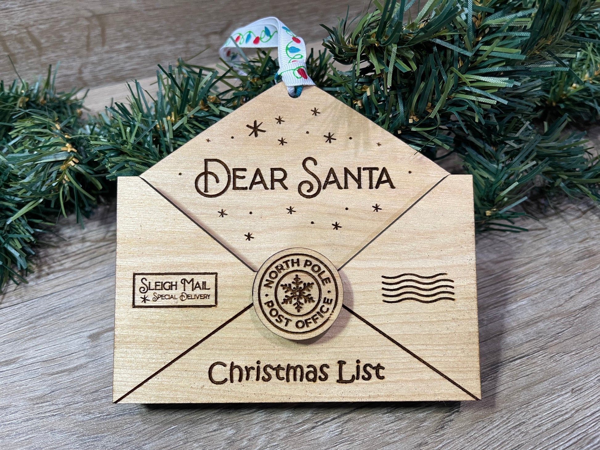 Solid wood stained envelope ornament. Has pocket that fits a letter to Santa or a gift card.