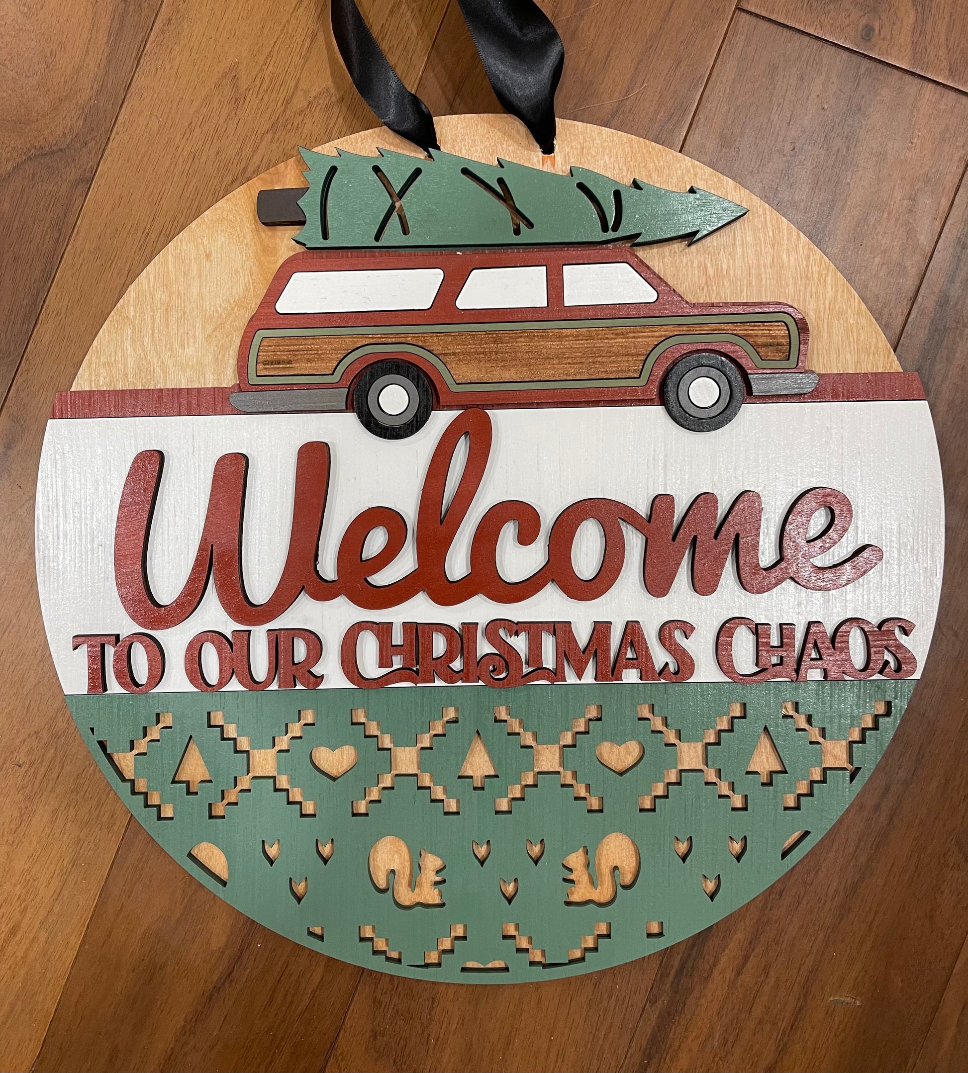 Wood backed round sign with laser cut “Welcome to our Christmas Chaos ”. Available in different sizes.