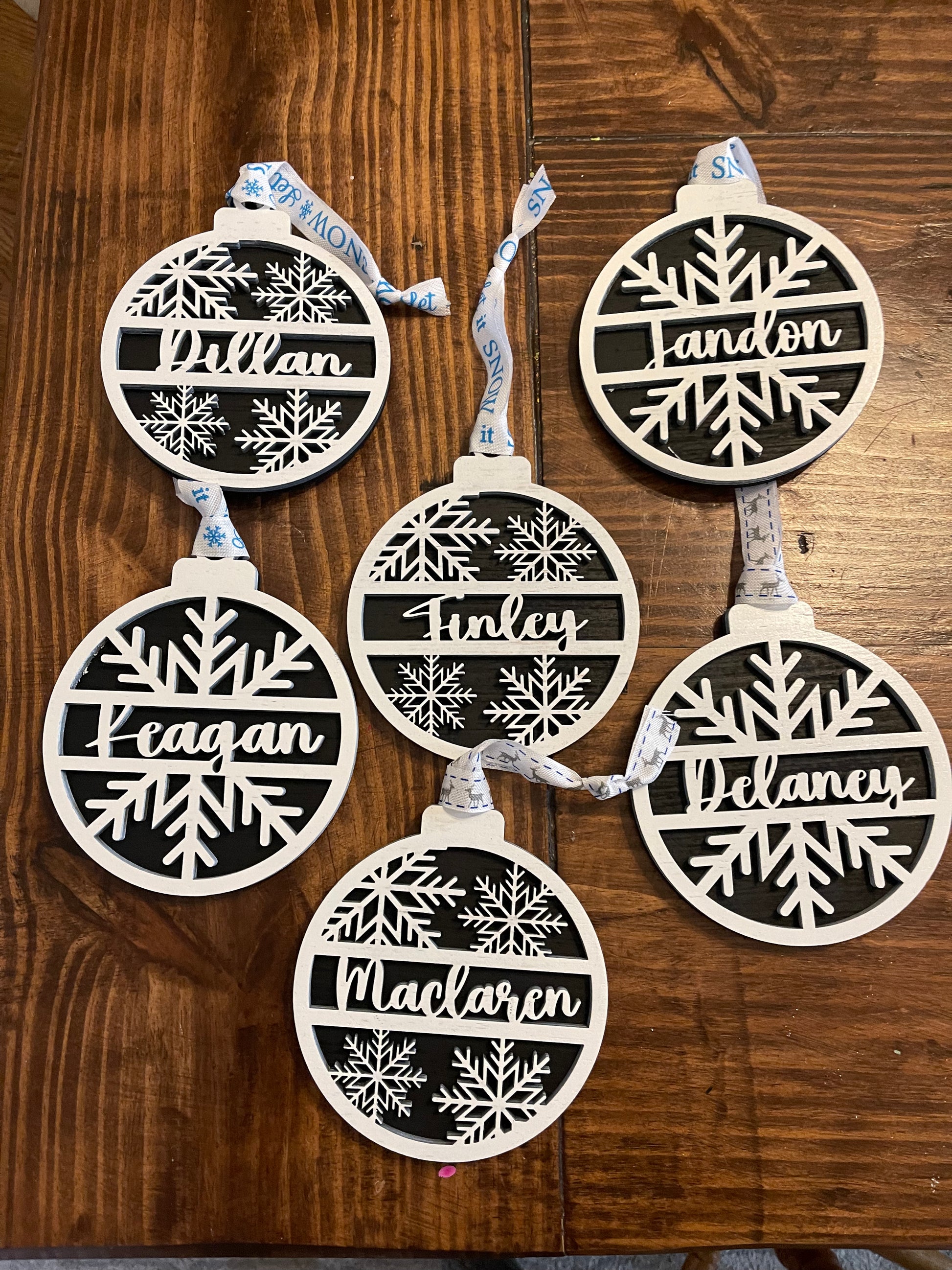 Multi Layered ornament with black painted wood backing and a white painted wood front. Leave name in personalization box.