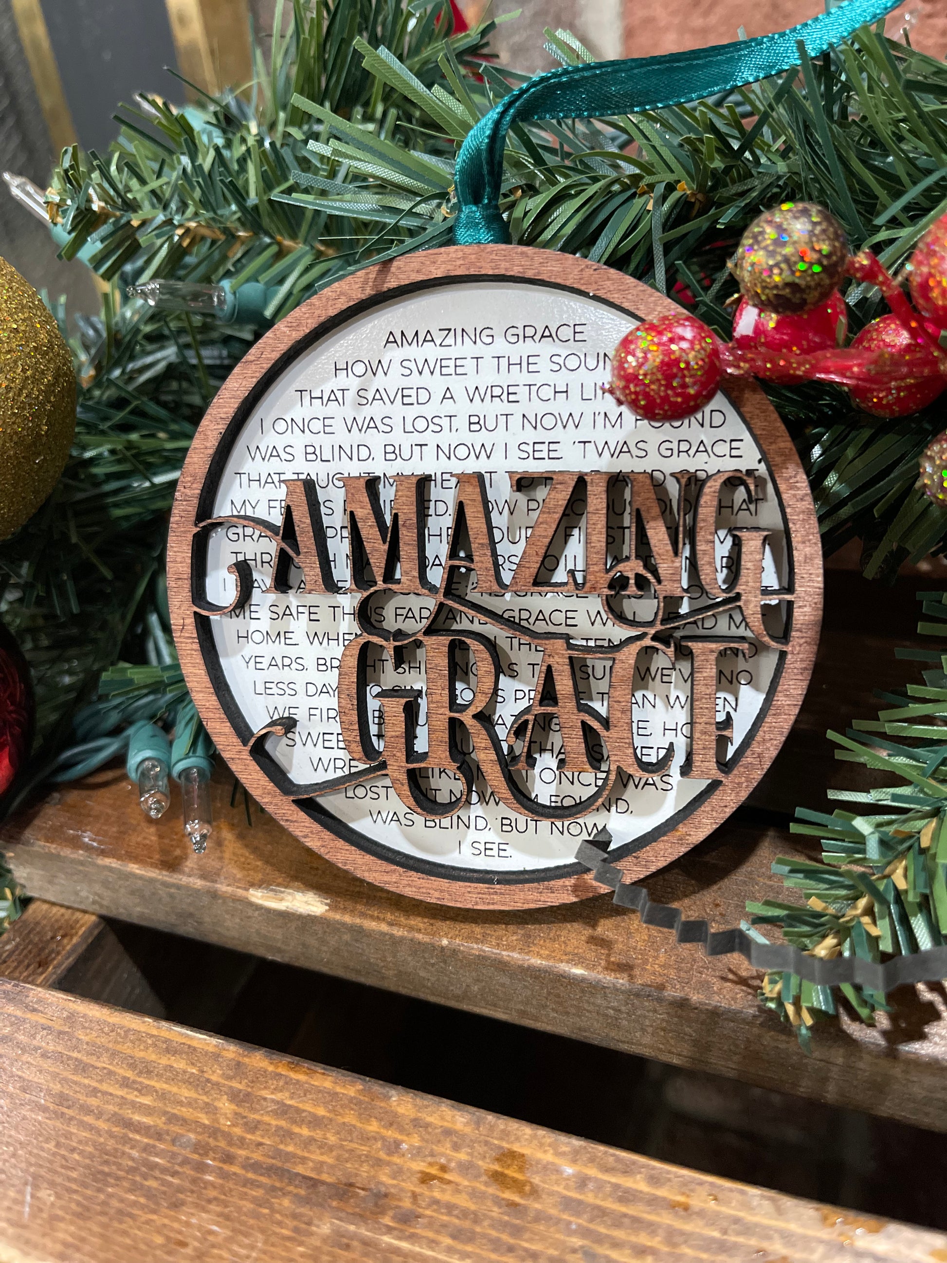 Multi Layered Ornament. Engraved whiteboard backing with stained wood front.