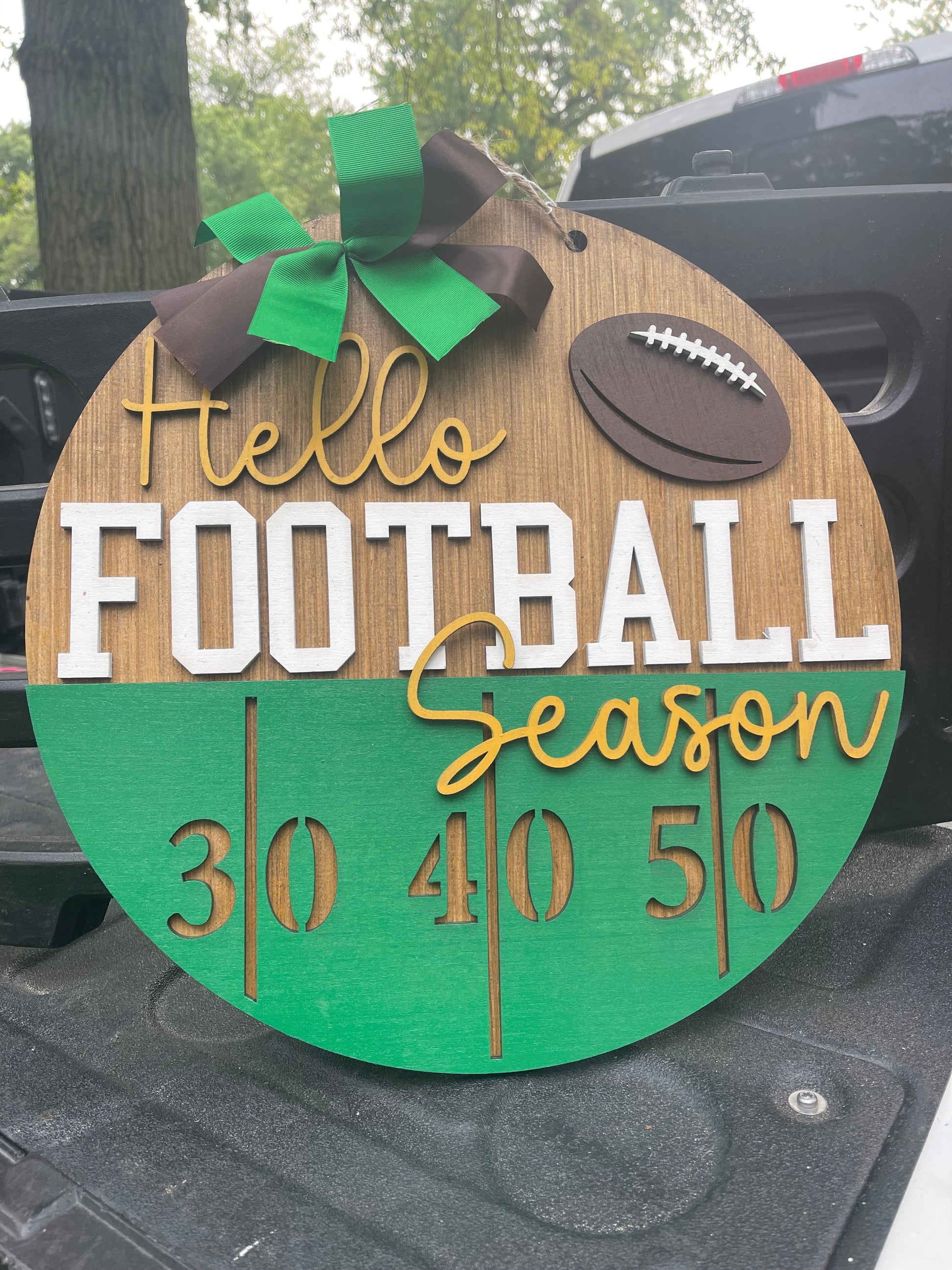 Wood backed round sign with laser cut and engraved “Hello Football Season ”. Available in different sizes.