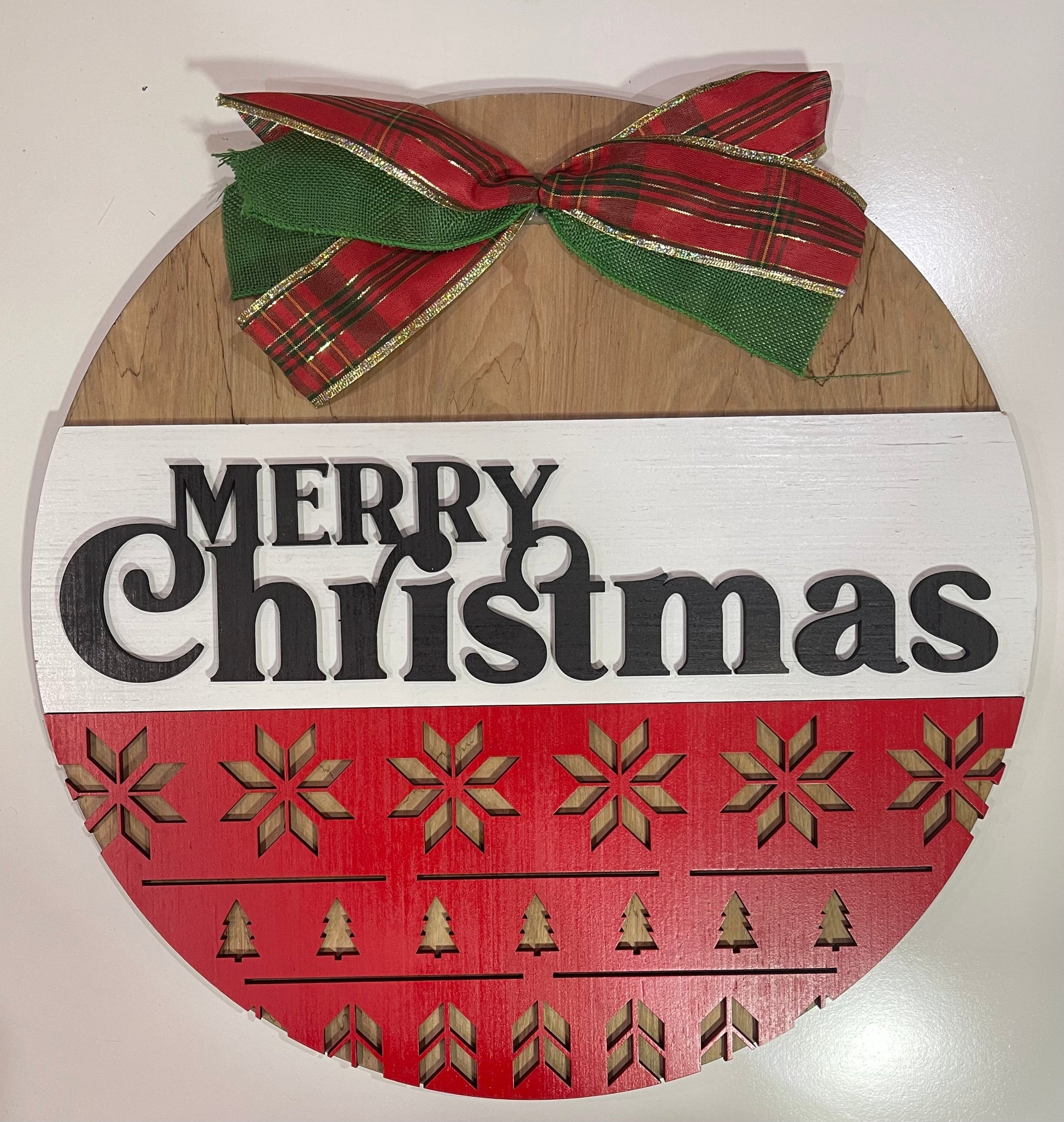 Wood backed round sign with laser cut and engraved “Merry Christmas ”. Available in different sizes.