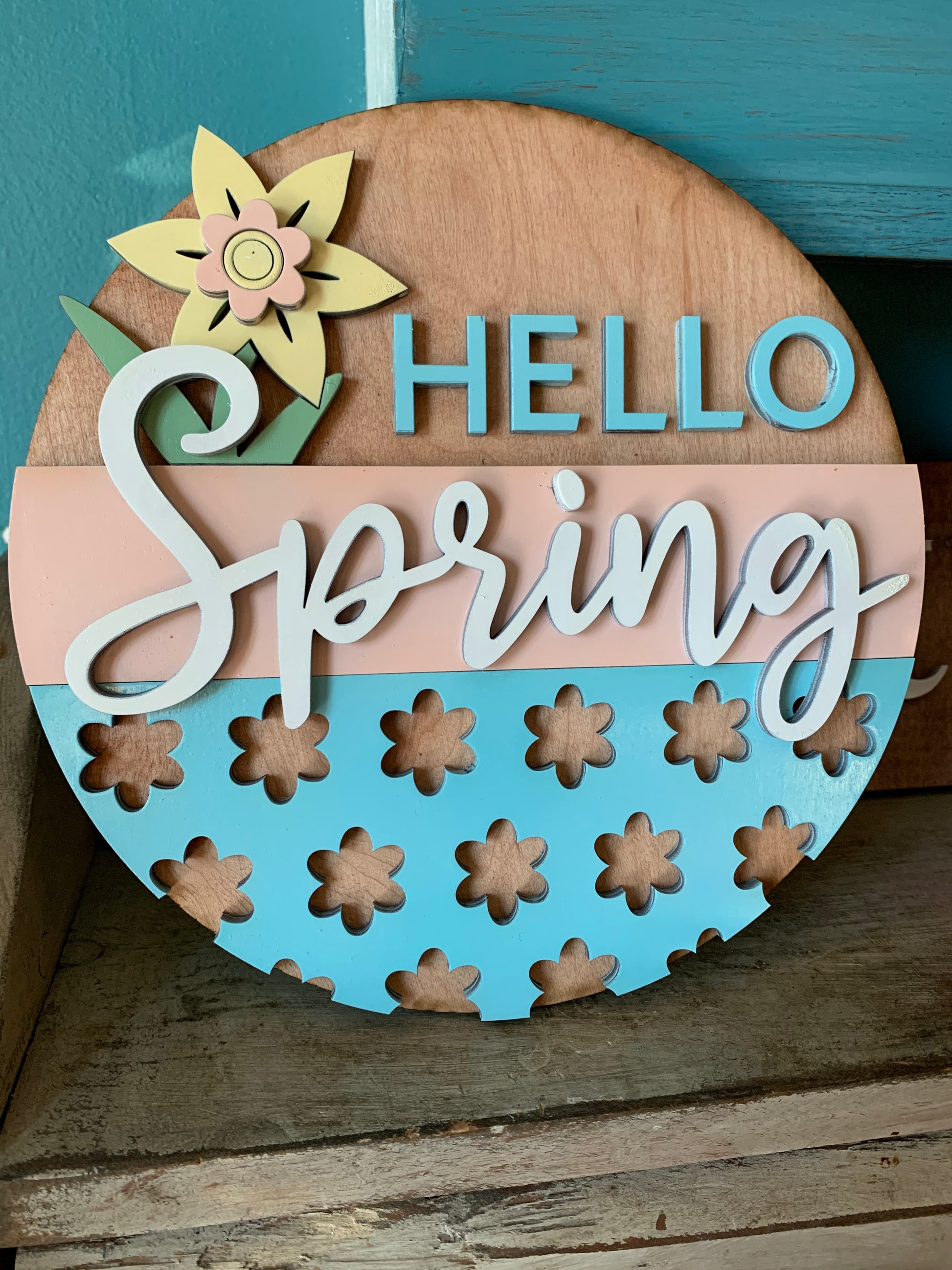 Solid Wood stained round sign with painted embellishments. Available in different sizes.