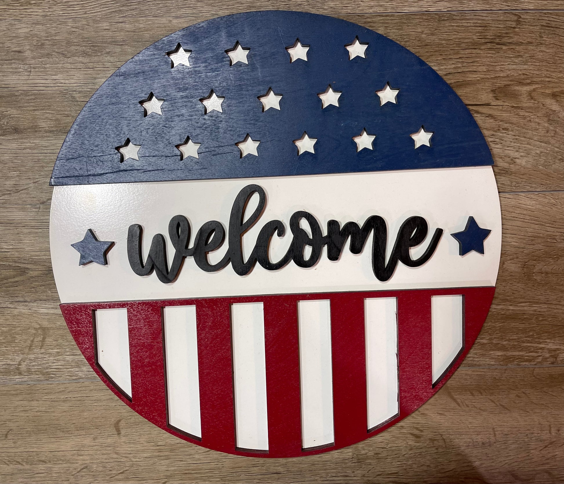 Solid Multi Layer Wood round sign with painted embellishments. Available in different sizes.