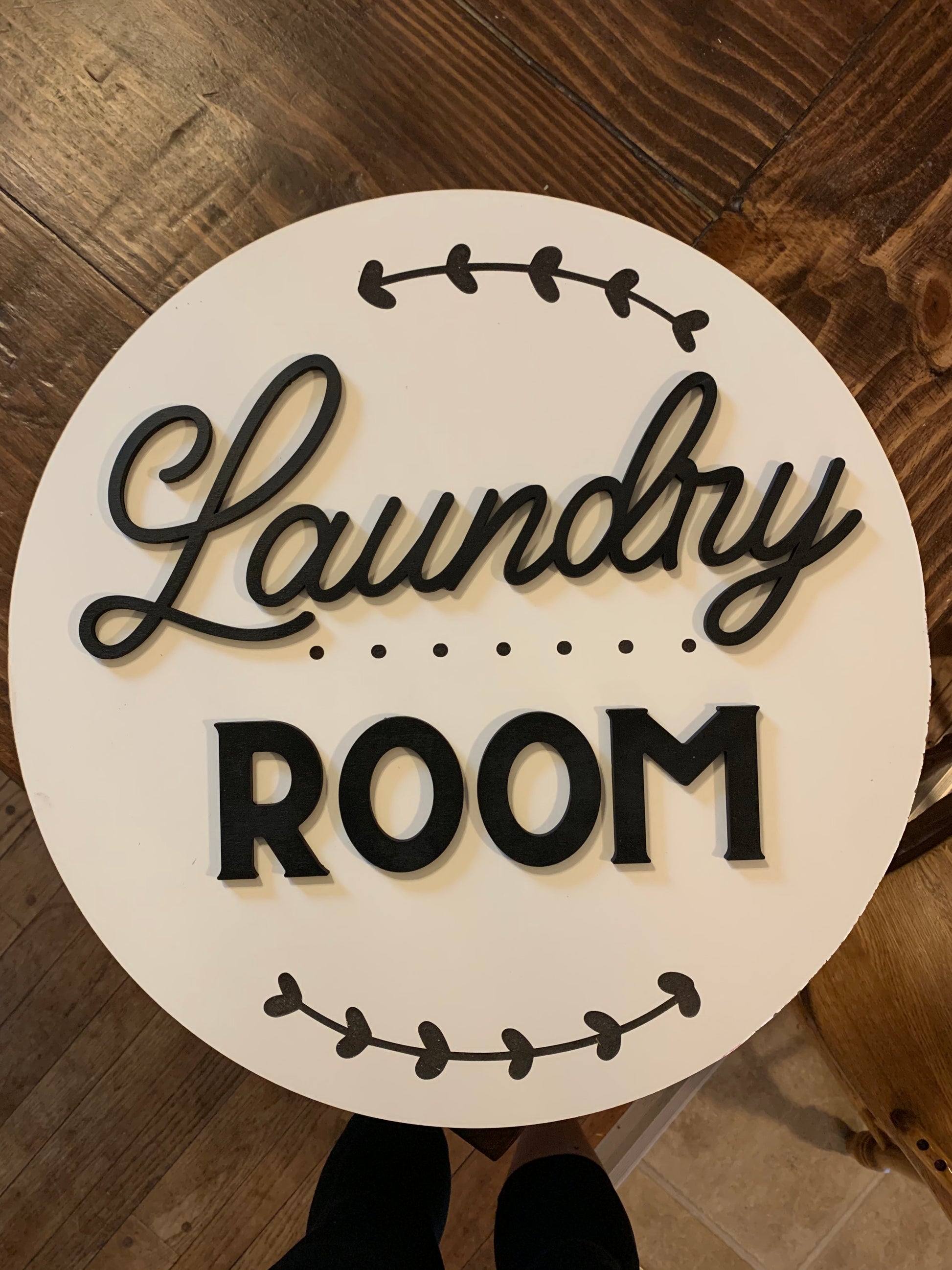 Wnote board backed round sign with laser cut and engraved Laundry Room ”. Available in different sizes.