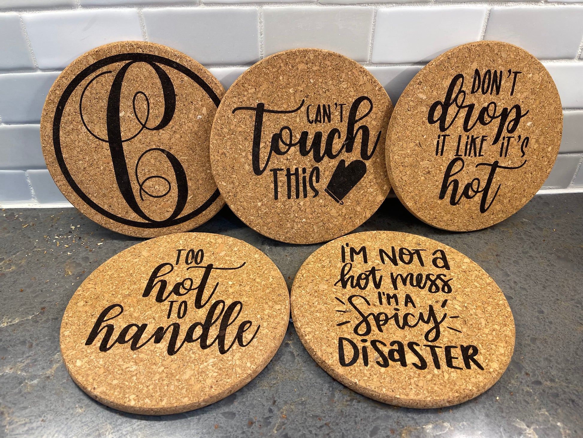 Various Cork Trivets. Multiple choices and personalization available. Size depends on stock available.