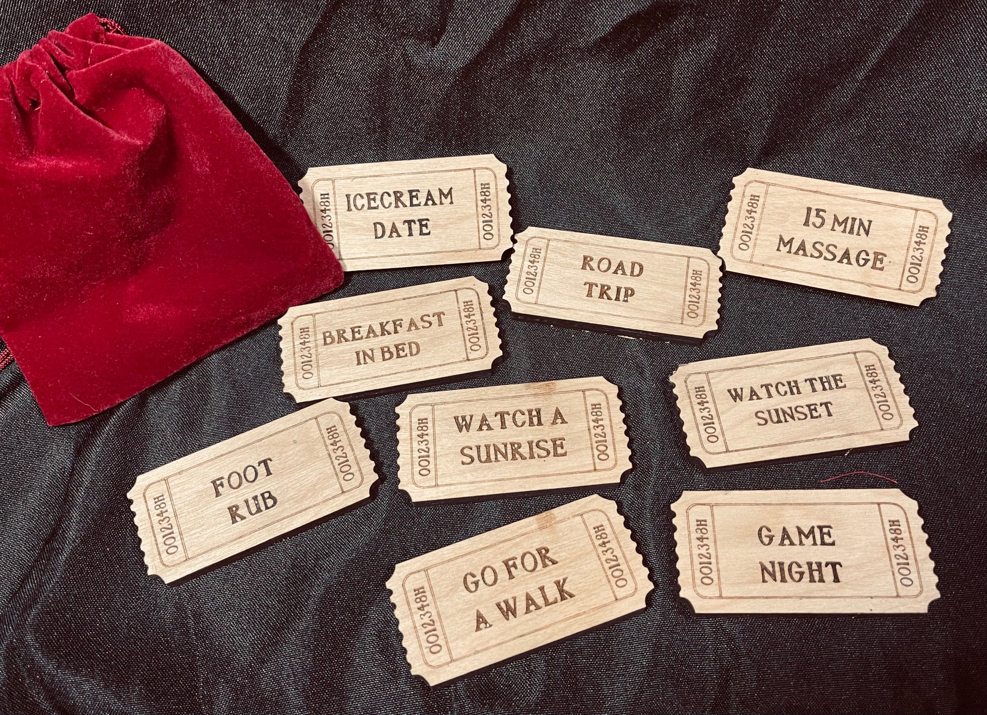 Nine assorted date ideas on solid wood ticket. Includes red velvet bag for carrying. Perfect for Valentines Day!