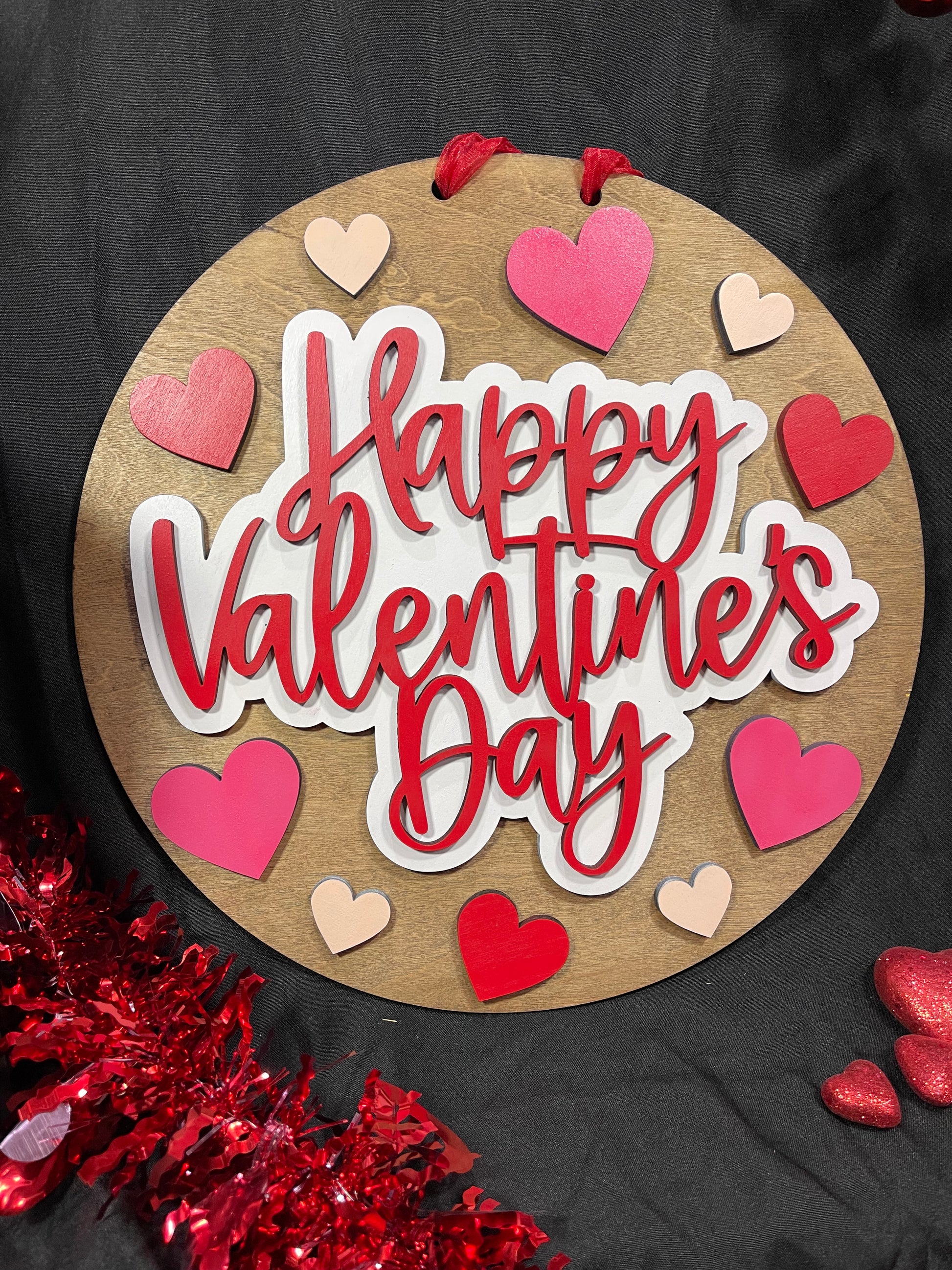 Solid wood stained round sign with painted Happy Valentines Day and Hearts. Great door hanger or wall decor for Valentines Day. Available in different sizes.