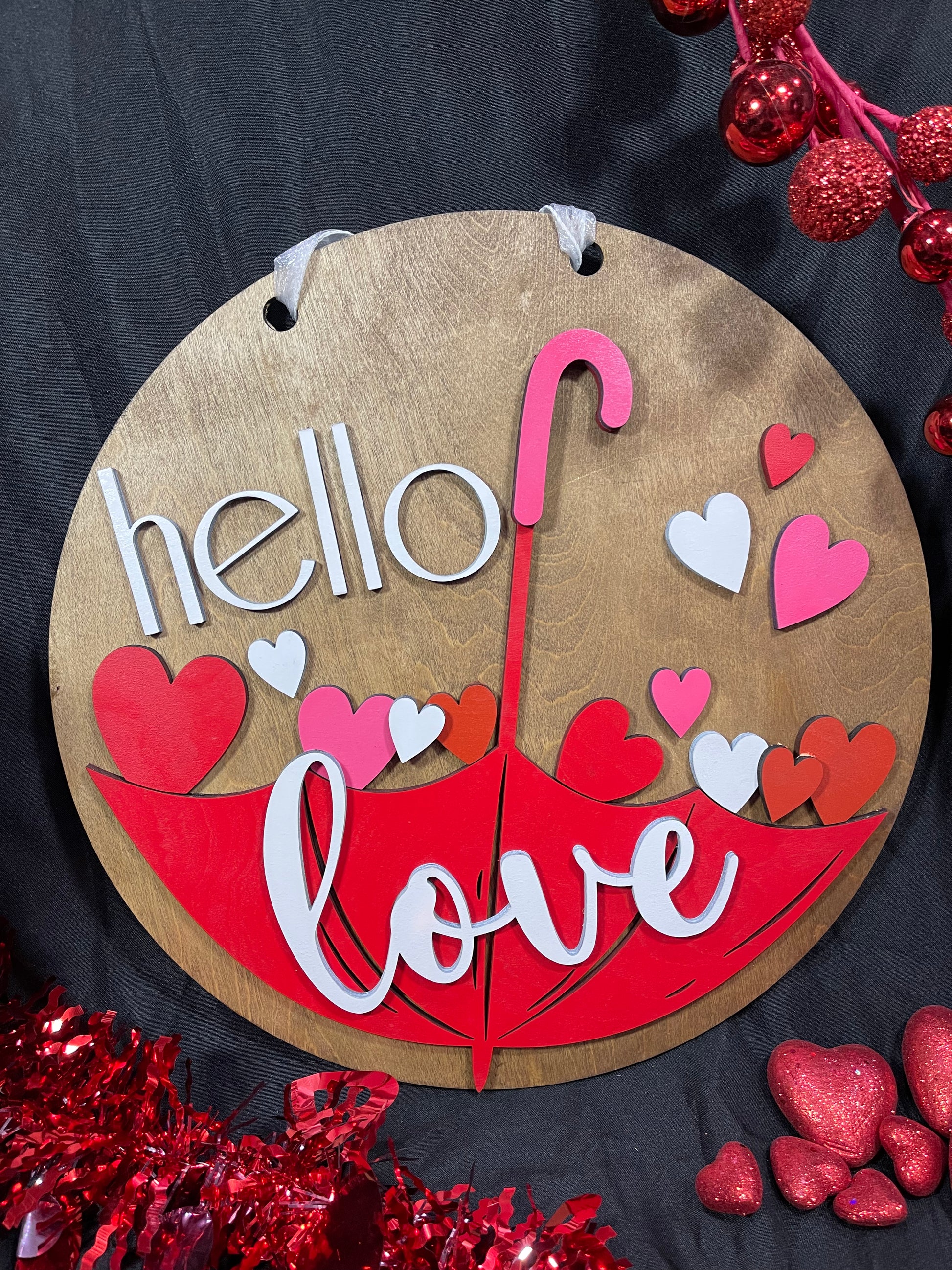 Solid Wood stained round sign with painted umbrella and hearts. Perfect for Valentines Day! Available in different sizes.