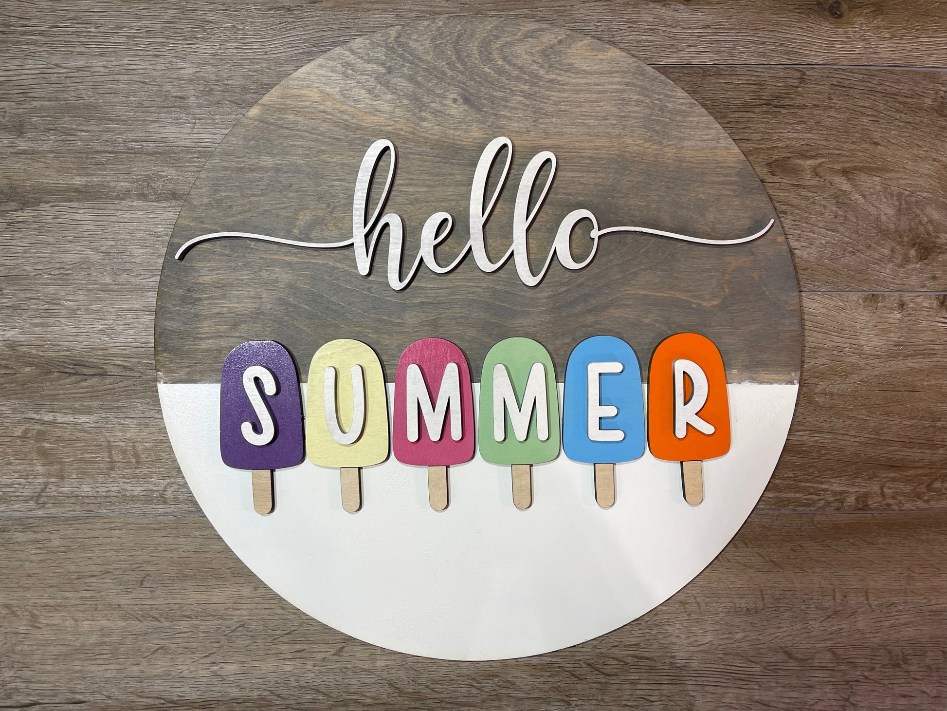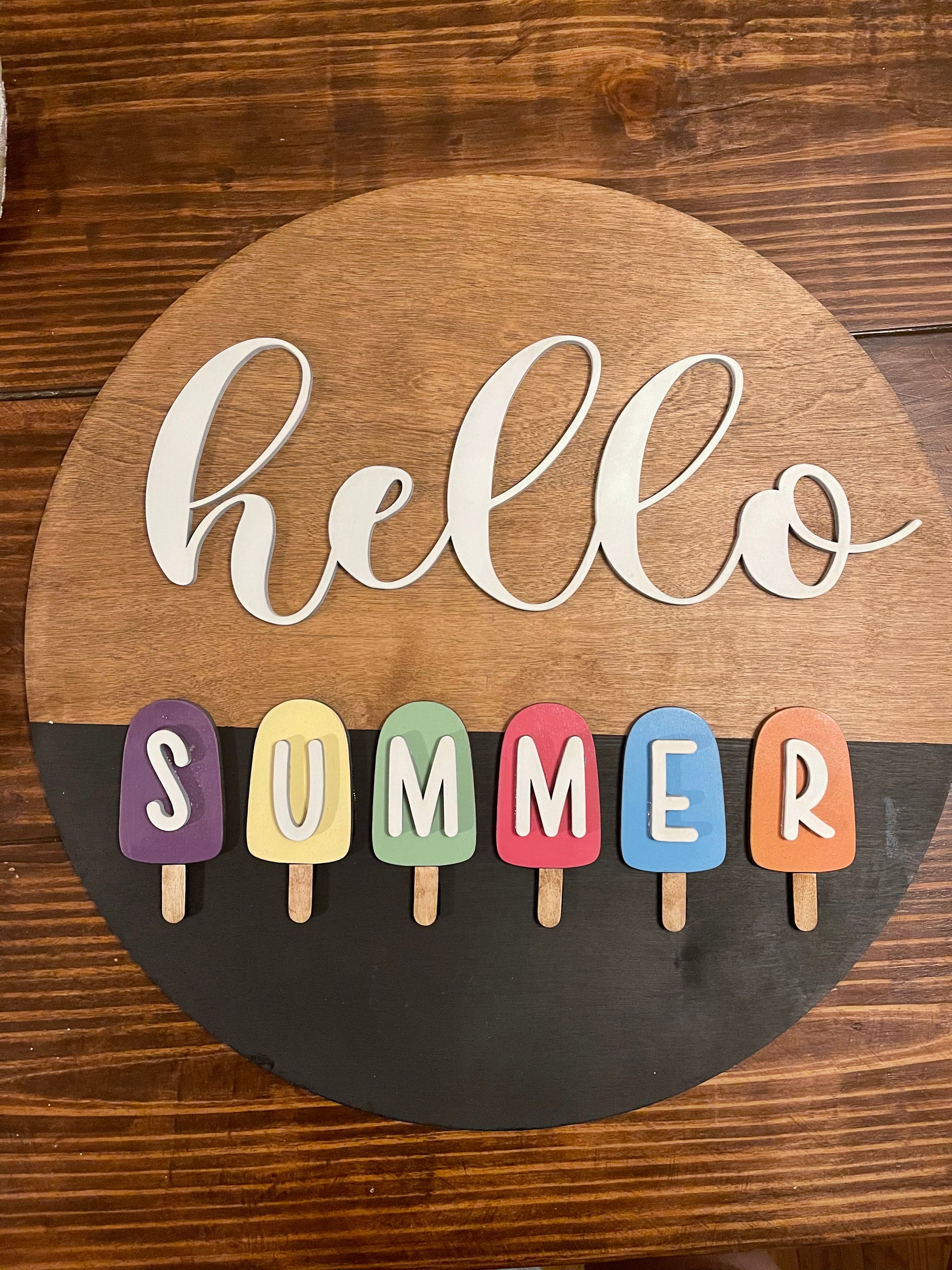 Solid Multi Layer Wood stained round sign with painted embellishments. Available in different sizes.