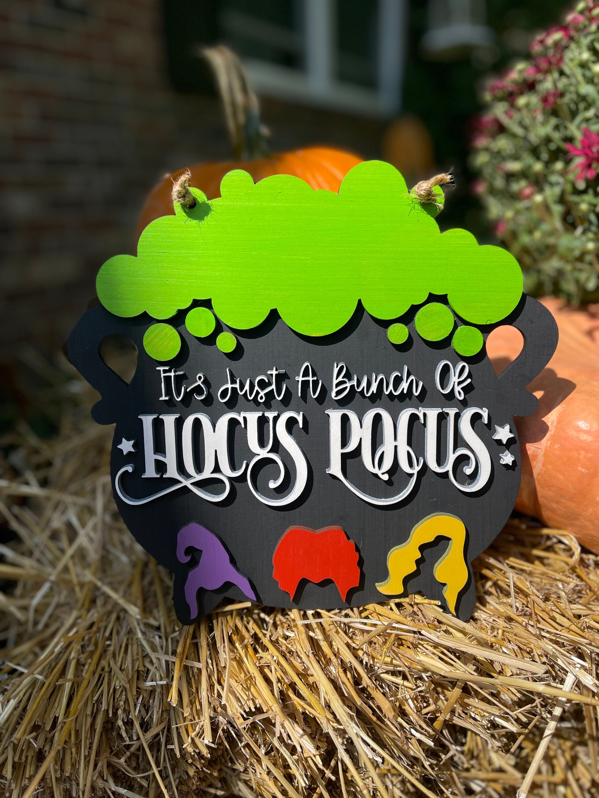 Wood painted hocus pocus sign with hanger. Measures 10.9 in x 10.5 in in size.