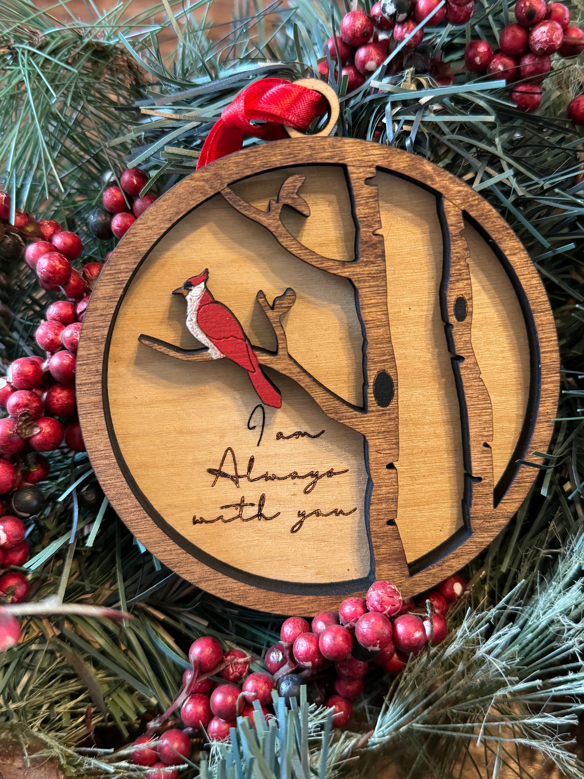 Ornament with Cardinal or Blue Jay on stained wood. Multi Layer with engraved “I am Always With You”.