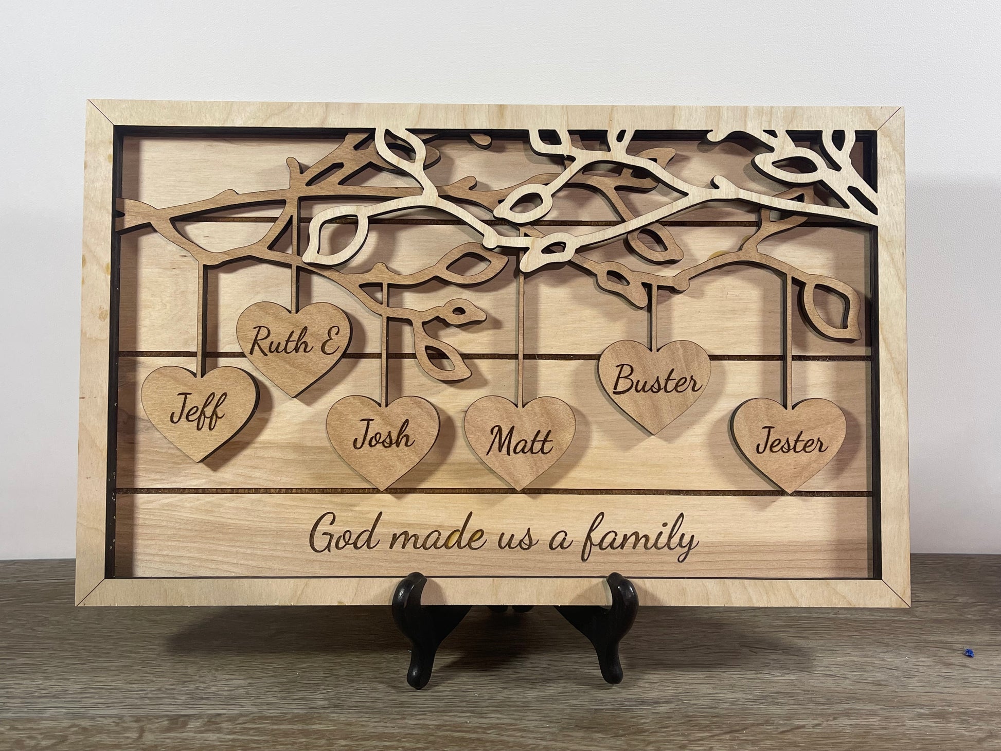 Solid wood multi layer family tree sign. Up to nine names can be added. God made us a family engraving and can be customized with different saying. Will be 6-8 inches wide depending on number of hearts.
