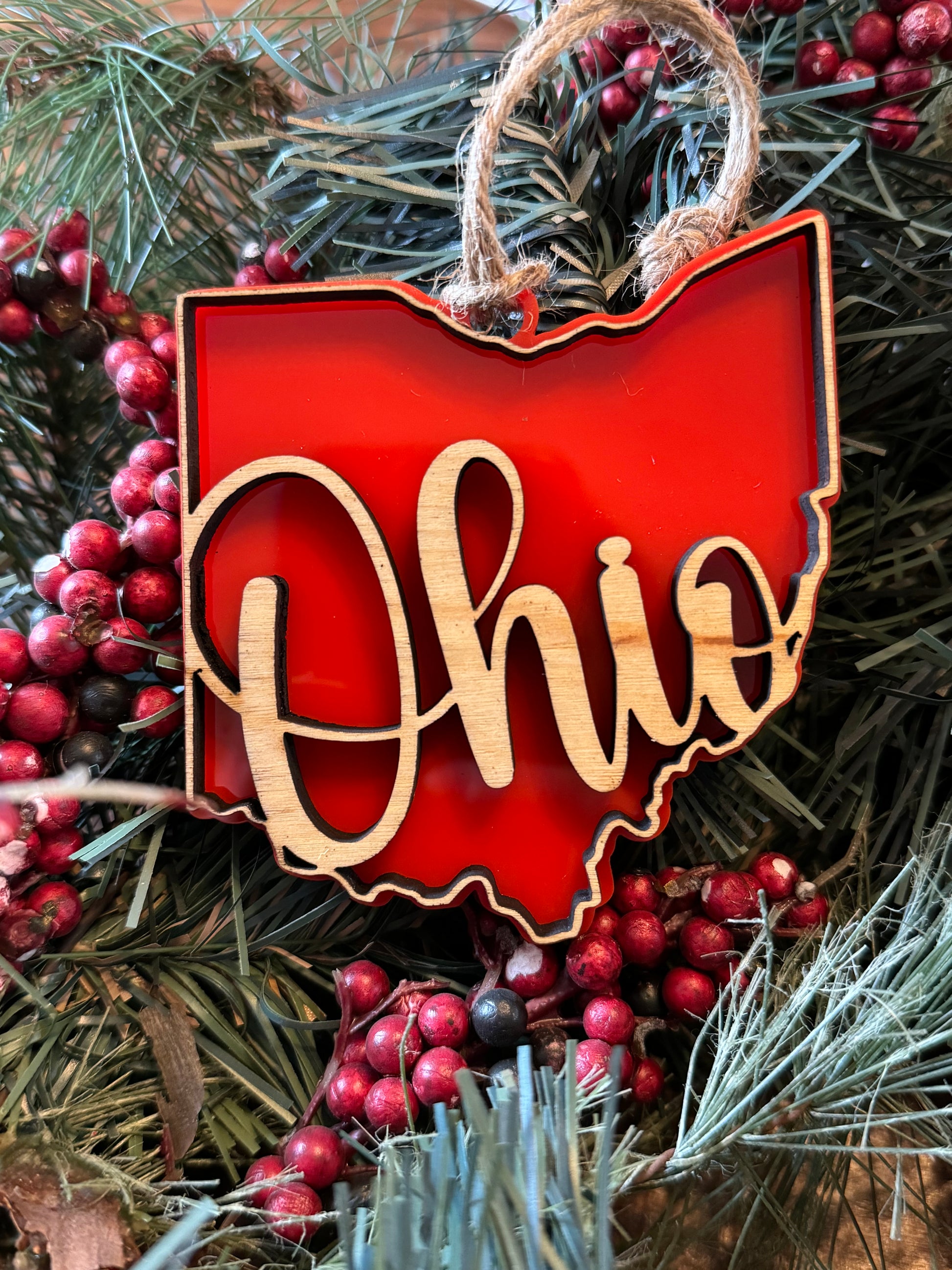 This is a two layer ornament with an acrylic backing and a wood cut top layer. Available in two color options