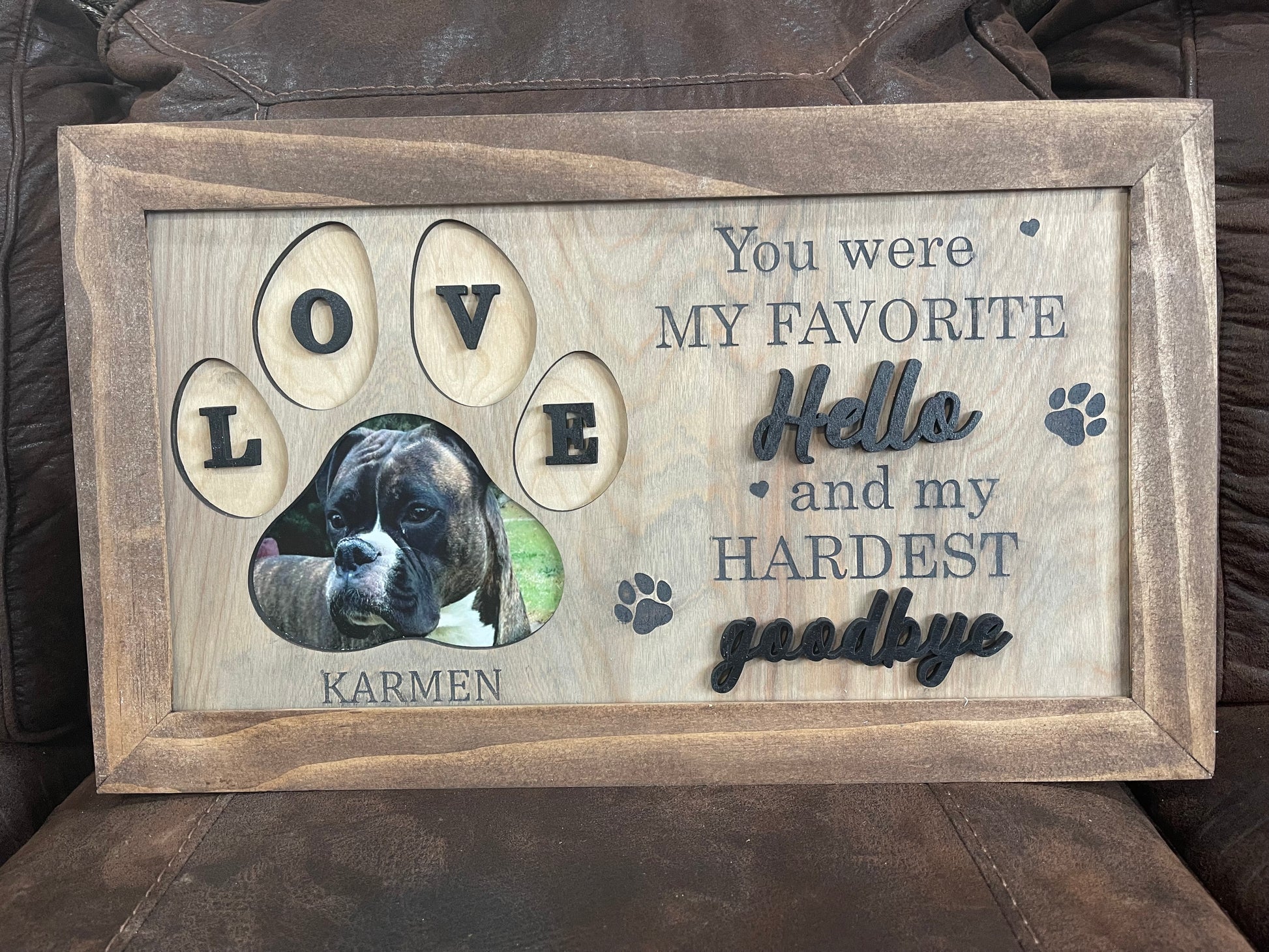 Remember your favorite lost pet with this personalized sign. Made with a stained wood backing and wood frame. Send pet photo and actual print will be added into sign as well as name. Size is 18.6 in by 10.2 in.