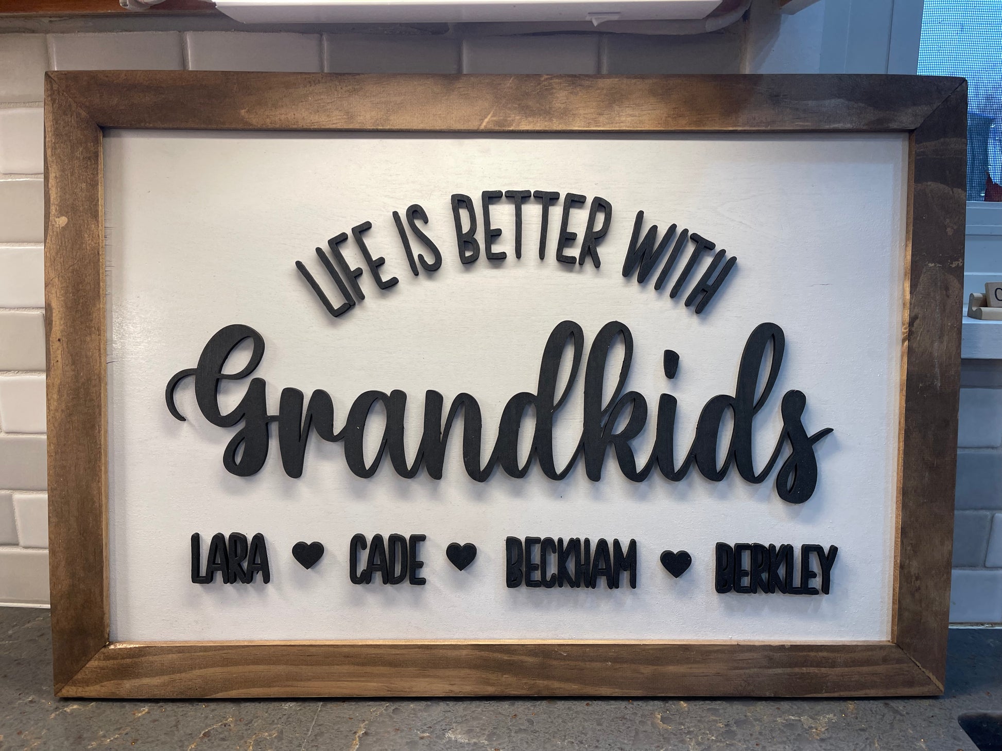 Personalized Life is Better with Grandkids sign. Solid wood background painted white with laser cut black wood lettering. Solid wood frame and available in multiple sizes.