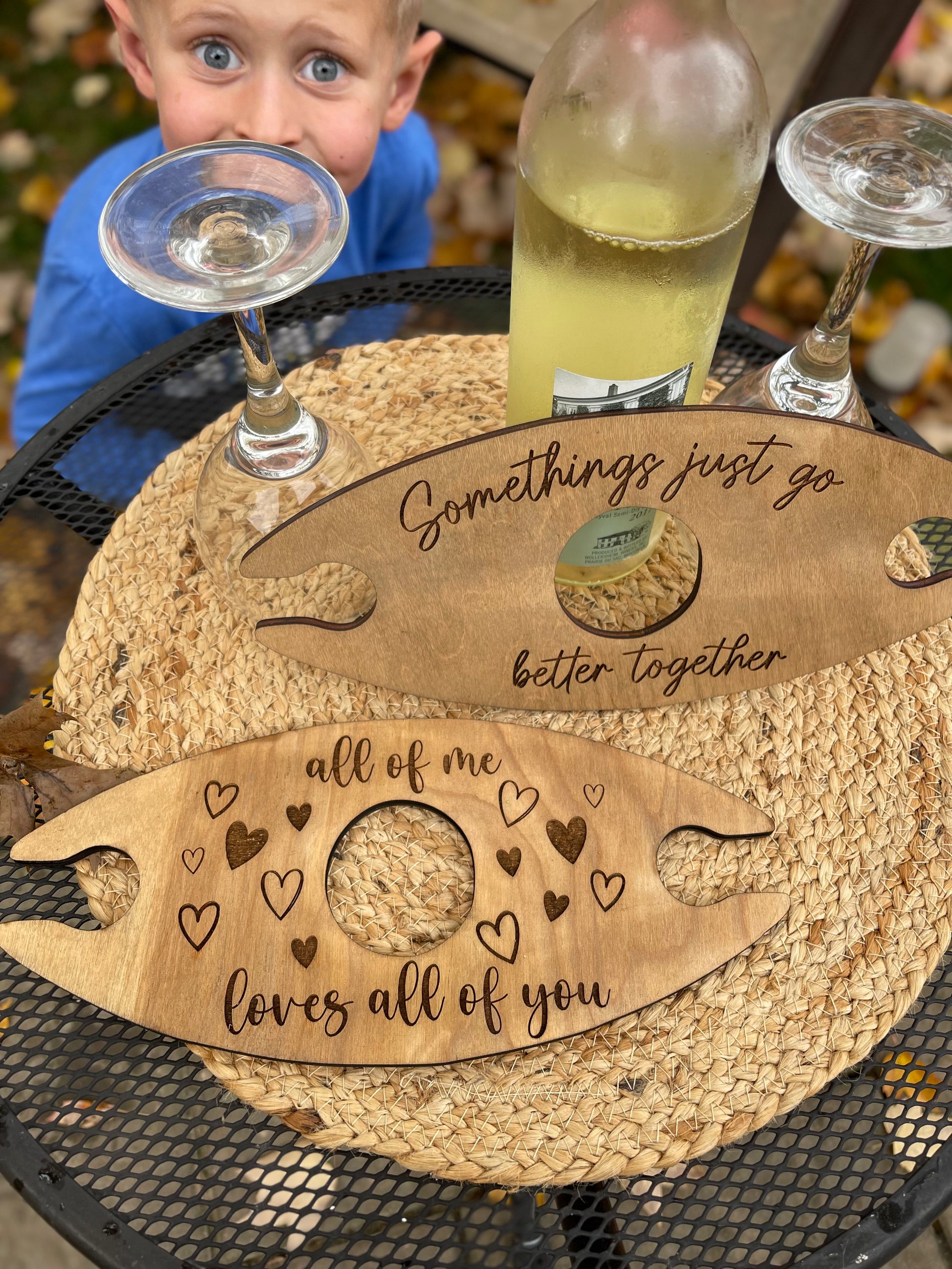 Wood stained and engraved holding two wine glasses and one bottle. Two options available.